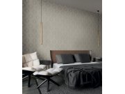 Šedá vliesová tapeta evokující látkovou texturu, zlatý plastický elegantní vzorek připomínající větvičky.