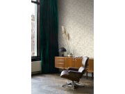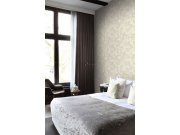 Šedo-béžová vliesová tapeta na zeď, jemně plastické zlaté obrysy stylizovaných listů, šedé detaily.