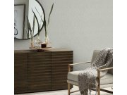 Šedokrémová hladká předklížená tapeta na zeď, bílé listy, ptáci, ornamentální zámecký vzor.