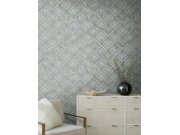 Šedo-modrá vliesová tapeta na zeď, stylizované lastury s metalickými odlesky.