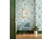 Světle modrá vliesová tapeta na zeď, květiny v odstínech modré, zelené a hnědé.