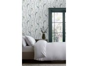 Vliesová květinová tapeta na zeď, rozkvetlé větvičky v odstínech zelené, bílé a šedé s metalickými detaily, světle modrý podklad.