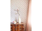 Hnědo-bílé květy na krémové lesklé vliesové tapetě s drobným zeleným puntíkem.