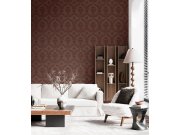 Luxusní terakotová vliesová tapeta s vinylovým povrchem, jemně plastický zámecký damaškový vzor v odstínech metalické vínové.