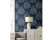 Přírodní a rostlinné motivy zpříjemní a zútulní každý interier. Tmavě modrá vliesová tapeta se světle modrým rostlinným motivem.