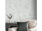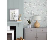 Hladká tyrkysová vliesová tapeta na zeď, motivy květin v odstínech bílé, šedé a fialové.