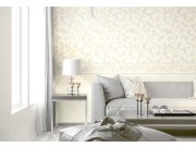 Luxusní vinylová tapeta se zlato-béžovým zámeckým ornamentálním vzorem, pololesklý béžový podklad má vzhled a texturu jemné textilie.