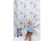 Design, který zútulní a rozveselí dětský pokojíček. Dinosauři v modré, šedé a fialové barvě na bílé vliesové tapetě s jemnou textilní strukturou.