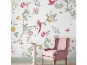 Obrazová vliesová tapeta s květy pivoněk a exotickými ptáky na světlém hladkém podkladu vnese do interiéru příjemnou atmosféru.