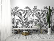 Vliesová fototapeta s vinylovým povrchem, černo-bílý vzor tropických listů. 3 díly 53 x 280 cm. Tapeta má navazující vzor, pokud potřebujete pokrýt širší stěnu, stačí přikoupit další kus (sadu 3 pruhů).