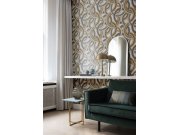 Vliesová tapeta s listy v odstínech hnědé, béžové, bílé, jemný pololesk.