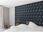 Vliesová geometrická 3D tapeta na zeď, imitace dřeva, odstíny modré a šedé.