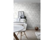 Vliesová tapeta s vinylovým povrchem a geometrickým vzorem. Vzhled a textura jemné textilie v přírodních / šedo-bílých odstínech, obrysy vzoru hnědé, místy pololesklé zlaté.