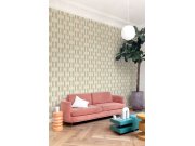 Geometrická vliesová tapeta s vinylovým povrchem - střídání jemného pololesku a matu, hladkých a strukturovaných ploch, odstíny béžové, hnědé a zelené. Foto interiéru je pouze ilustrační.