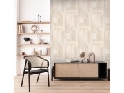 Luxusní plastická vliesová tapeta s vinylovým povrchem, geometrický vzor v odstínech hnědé, béžové, krémové a šedo-hnědé; hrubší textura. Foto interiéru je pouze ilustrační - odlišné barvy.