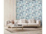 Luxusní plastická vliesová tapeta s vinylovým povrchem, geometrický vzor v odstínech hnědé, béžové, krémové, modré a šedo-modré; hrubší textura.