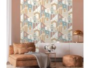 Grafická vliesová tapeta na zeď, odstíny hnědo-červené, modré, okrové, zelené a šedo-béžové, architektonický design. z 5 dílů 0,53 x 280cm. Tapeta má navazující vzor, pokud potřebujete pokrýt širší stěnu, stačí přikoupit další kus (sadu 5 pruhů). Jednotli
