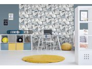 Design, který zútulní a rozveselí dětský pokojíček. Dinosauři v modré, šedé a fialové barvě na bílé vliesové tapetě s jemnou textilní strukturou.