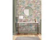 Světle šedá vliesová tapeta na zeď, květinový vzor v zelené, starorůžové, hnědé a okrové.