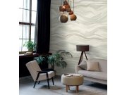 Vliesová obrazová tapeta, vlnky v šedo-béžových odstínech s metalickými zlatými liniemi. Tapeta má návazný vzor, pro větší šířku stačí koupit další kus.