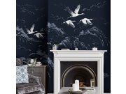 Obrazová vliesová tapeta s letícími čápy na tmavě modrém hladkém podkladu vnese do interiéru příjemnou atmosféru.