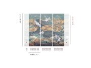 Vliesová obrazová tapeta na zeď, jemná textilní textura, pozadí v odstínech zelené, šedé a bílé, zlato hnědé kvetoucí sakury a letící bílo šedí jeřábi s červenou chocholkou. Pro větší šířku lze kombinovat s tapetou DGTRA4031-300 a DGTRA4032-300 viz foto.
