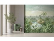 Vliesová tapeta na zeď, krajina s palmami a tropickými listy, odstíny zelené, modré a okrové. ze 4 dílů 0,53 x 280cm . Tapeta má navazující vzor, pokud potřebujete pokrýt širší stěnu, stačí přikoupit další kus (sadu 4 pruhů). Jednotlivé pruhy samostatně o