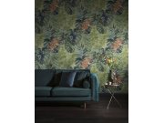 Vliesová tapeta. Podklad černý, vzor odstíny zelené, hnědé a oranžové, jemná látková textura.