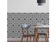 Kuchyňská vliesová tapeta s vinylovým povrchem se světle šedými a černými ornamenty, imitace obdélníkového obkladu cca 32x26cm. Foto interiéru je pouze ilustrační.