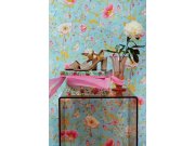 Luxusní květinová tapeta - podklad vlies, povrch plastický vinyl. Velký květinový vzor, podklad plastický vzorek. Barvy na tapetě - podklad šedý s drobnými zlatými třpytkami, vzor odstíny modré, růžové, zelené, béžové.
