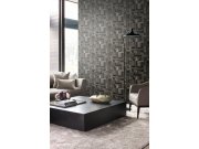 Geometrická vliesová tapeta na zeď, odstíny šedé a černé. Motiv dřeva a mramoru, metalické obrysy. Prostřih 0 nebo 38,8cm.