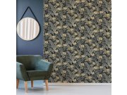 Luxusní květinová tapeta - podklad vlies, povrch plastický vinyl. Velký květinový vzor, podklad plastický vzorek. Barvy na tapetě - podklad černá s drobnými zlatými třpytkami, vzor odstíny metalické modré, zelené, béžové, šedé.