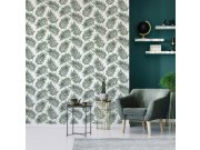 Vliesová tapeta s listy v odstínech zelené a bílé.