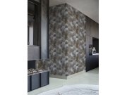 Design tropických listů, podklad netradiční jemně plastický geometrický vzor v odstínech hnědé. Metalický pololesk. Snadno zkombinujete se souvisejícími vzory. Podklad vlies, povrch vinyl.