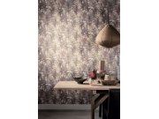 Luxusní květinová tapeta - podklad vlies, povrch plastický vinyl. Velký květinový vzor, podklad plastický vzorek. Barvy na tapetě - podklad hnědá s metalickým leskem a drobnými třpytkami, vzor odstíny šedo-modré, stříbrné a zlaté.
