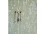 Vliesová tapeta s jemně plastickým povrchem, design lučních rostlin v šedo-bílých odstínech na šedo-zeleném podkladu.