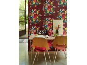 Pestré kytice květů na hnědo-vínové vliesové tapetě.