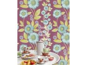 Přírodní a rostlinné motivy zpříjemní a zútulní každý interier. Květinový vzor ve fialové, bílé a žluté barvě na modrém podkladu.