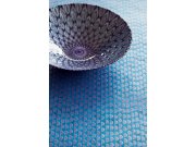 Jemně elegantní fialové třpytivé polokoule na metalické modré mramorované vliesové tapetě. Reflect = zrcadlení. Zrcadlení je kolekce vliesových tapet plná iluzí s luxusním designem v zářivých barvách, pozvedne váš interiér jemnými odstíny a krásným třpyte