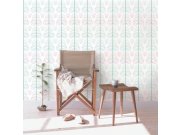 Rostlinný motiv v tyrkysové a fialové barvě na bílé vliesové tapetě.