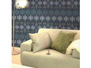 Tyrkysový a bílý vzor na zelené vliesové tapetě.