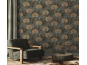 Vliesová tapeta s geometrickým vzorem květin a listů v tmavě zelených a hnědých tónech s metalickými liniemi na strukturovaném podkladu vnese do interiéru příjemnou atmosféru luxusu.