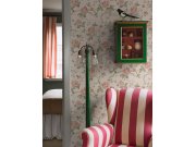 Vliesová tapeta na zeď, béžový proužkový podklad, motiv květin v odstínech zelené, šedo-modré, červené, oranžové. Co vás zaujme: vyrobeno s ohledem na udržitelnost a ekologii. Design: klasický, přírodní. Úroveň tapetování: pro začátečníky. Země původu: Šv