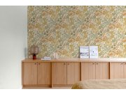 Vliesová tapeta s vinylovým povrchem, béžový podklad, stylizované květiny v odstínech hnědé, zelené, béžové a šedé, jemná textura.