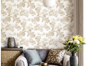 Luxusní plastická vliesová tapeta s vinylovým povrchem, motivy větviček a listů v odstínech šedo-béžové se zlatými odlesky. Foto interiéru je pouze ilustrační - odlišné barvy.