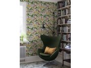 Vlisová tapeta s jemně plastickou texturou. Velké květiny, rostliny a ptáci. Podklad je bílý, se světle zeleným drobným vzorkem "sluníček".
