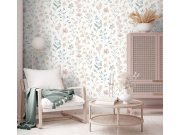 Vliesová tapeta na zeď, květinový vzor v odstínech modré, tyrkysové, hnědé a růžovo-béžové, bílý podklad, vzhled a struktura látky. Co vás zaujme: vysoká odolnost a omyvatelnost. Design: přírodní. Úroveň tapetování: pro začátečníky. Země půvoodu: Belgie.