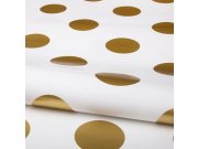 Vliesová, bílá tapeta se zlatými kovově lesklými puntíky.