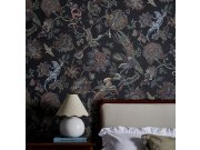 Luxusní vliesová tapeta s motivem květin, motýlů a ptáků v pestrých barvách na tmavě šedém podkladu.