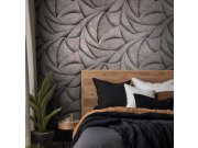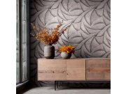 Černá strukturovaná vliesová tapeta na zeď, imitace štukové omítky, dekor listů a květiny v odstínech šedé a bronzové.